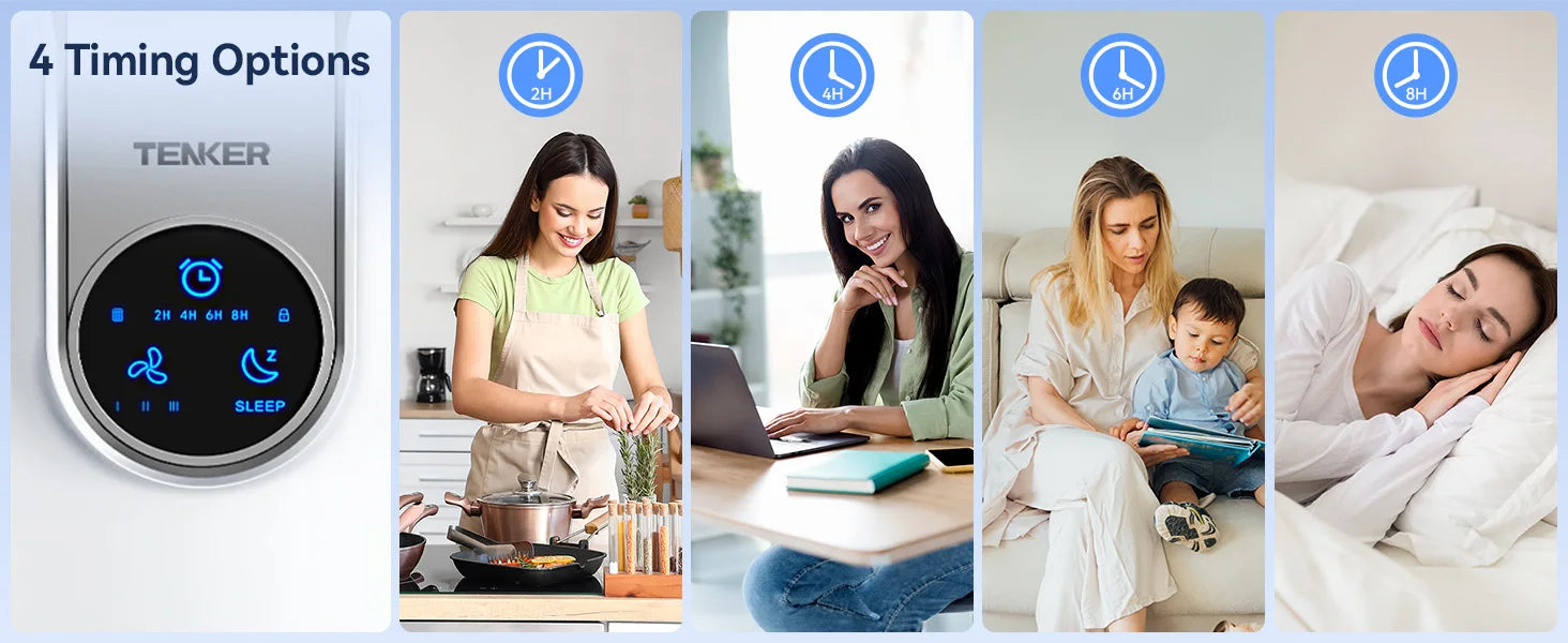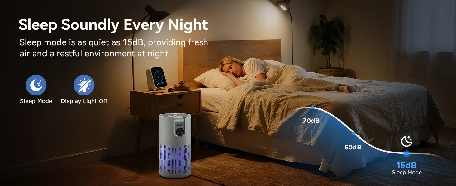 Featuring four timer presets (2H/4H/6H/8H) and four fan modes (Sleep/Low/Med/High), it captures air pollutants as needed. The 15dB sleep mode operates silently, ensuring undisturbed sleep—even light-sleeping babies can enjoy comfortable air on quiet nights. The child safety lock prevents accidental operations by pets or kids (the night light can be toggled on/off at any time).