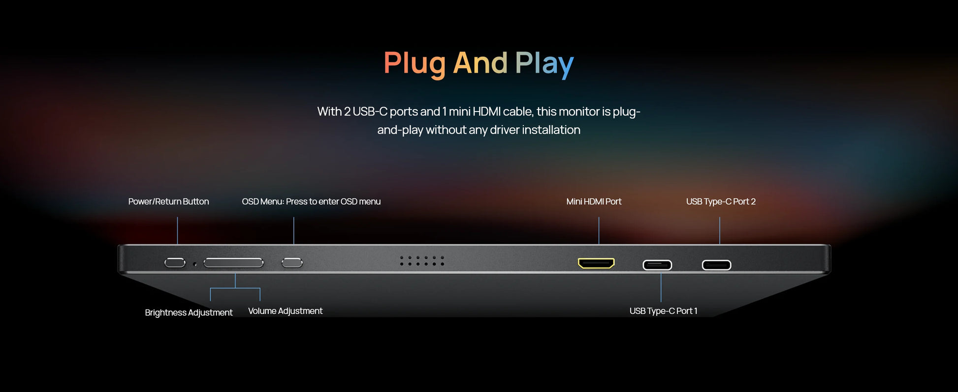 • Multi-Port Compatibility】:This portable monitor is equipped with dual USB-C ports on both sides and a mini HDMI port, compatible with a wide range of devices: Mac, laptops, desktops, Switch, PS, Xbox, phones (with Type-C port; for iPhone: a Lightning to HDMI adapter is required), etc.