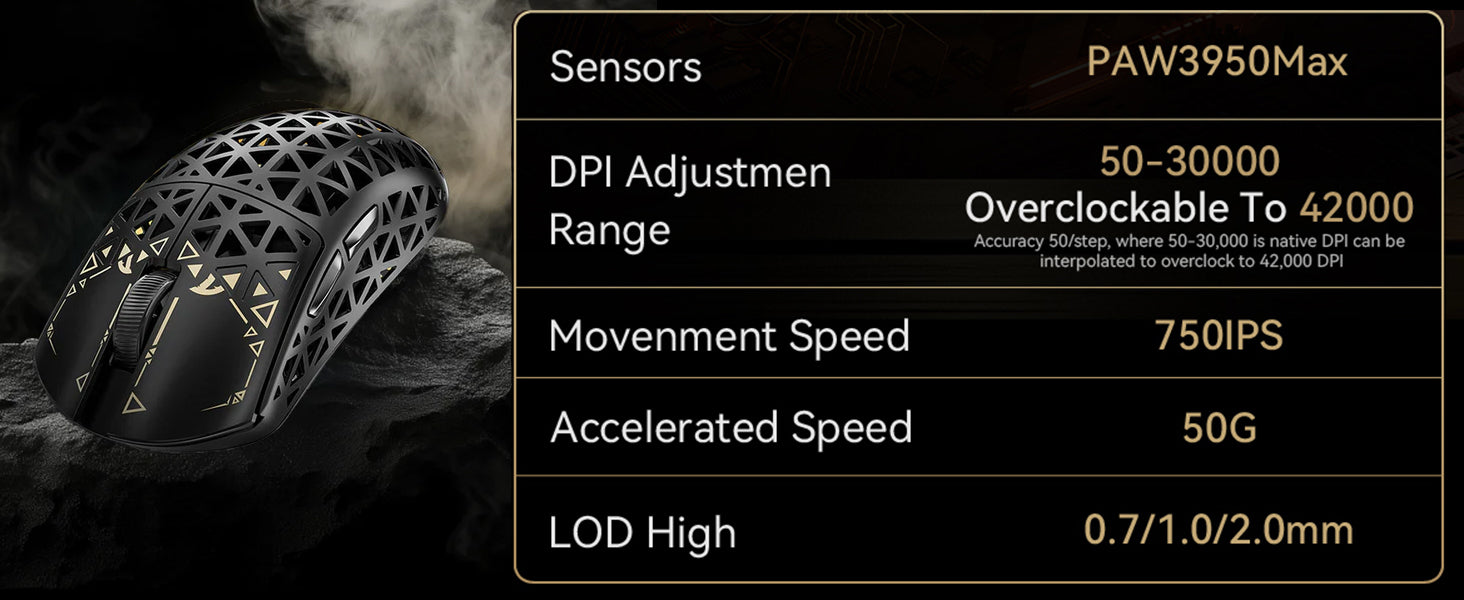 Equipped with the PixArt PAW3950 MAX sensor and Nordic52840 chip, via 8K wireless (custom receiver) or 1K wired mode providing zero-lag tracking and hyper-accurate for fast-paced, competitive games. Capable of 42,000 programmable DPI, 650 IPS speed, 50g acceleration, perfect for lining up head-shots or precise MMO spells.