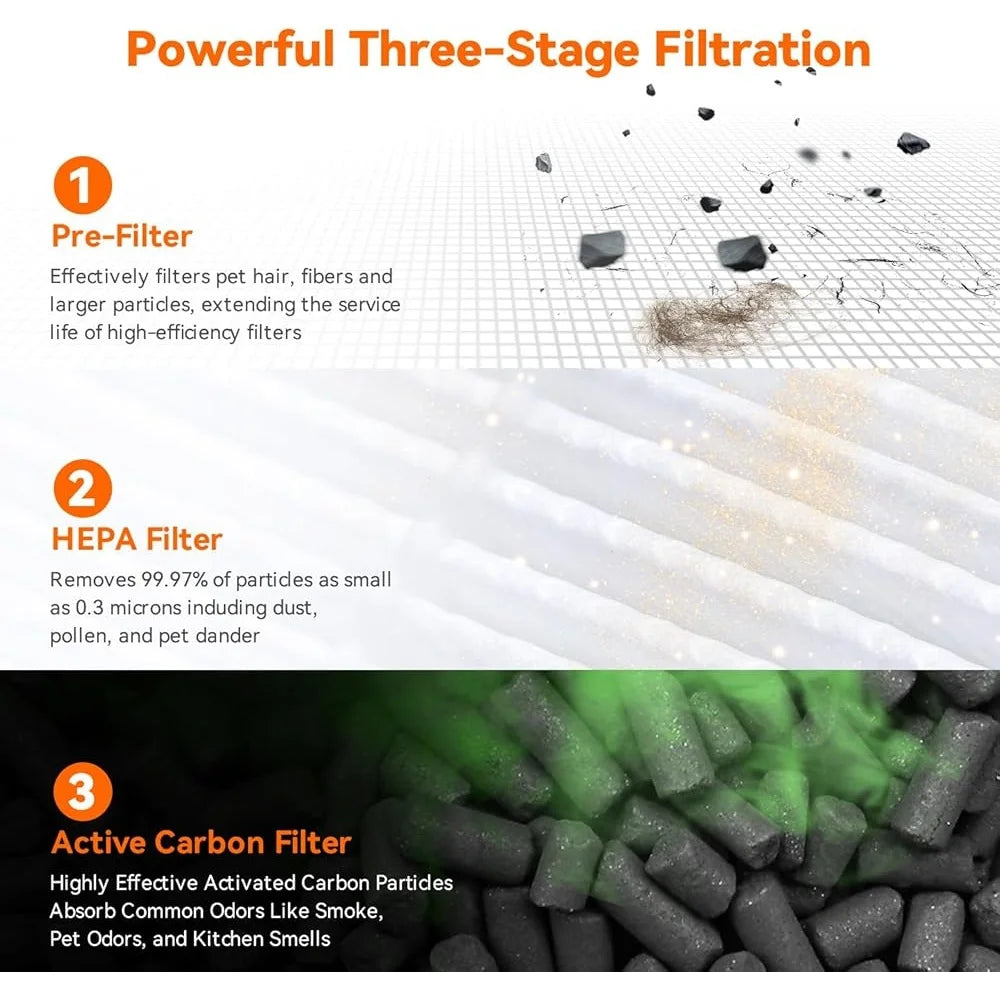 : The noise level of our high-efficiency activated carbon particle filter air purifier is as low as 22 decibels, as quiet as breathing, ensuring a tranquil environment while effectively purifying the air. est assured of the product quality - all our materials are meticulously selected, and our air purifiers have undergone multiple quality tests and certifications: Energy Star,ETL,CARB,EPA,CA65,FCC.