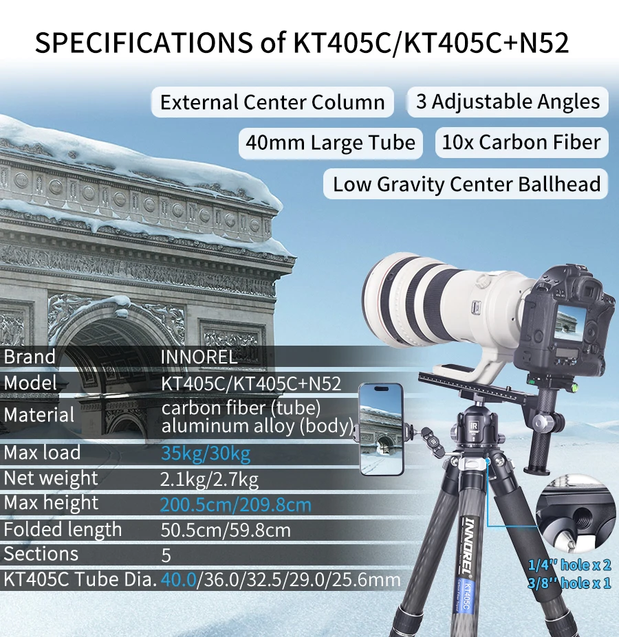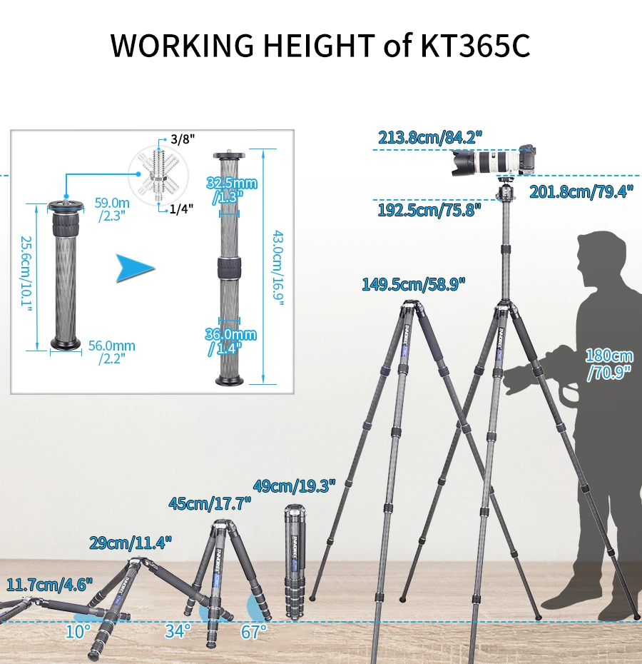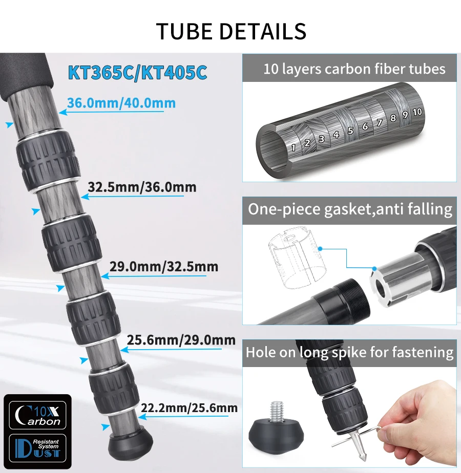 KT365C/KT405C 10 Layers Carbon Fiber Tripod for DSLR Camera 5 Sections Heavy Duty Stand Low Gravity Ballhead Short Center Column
