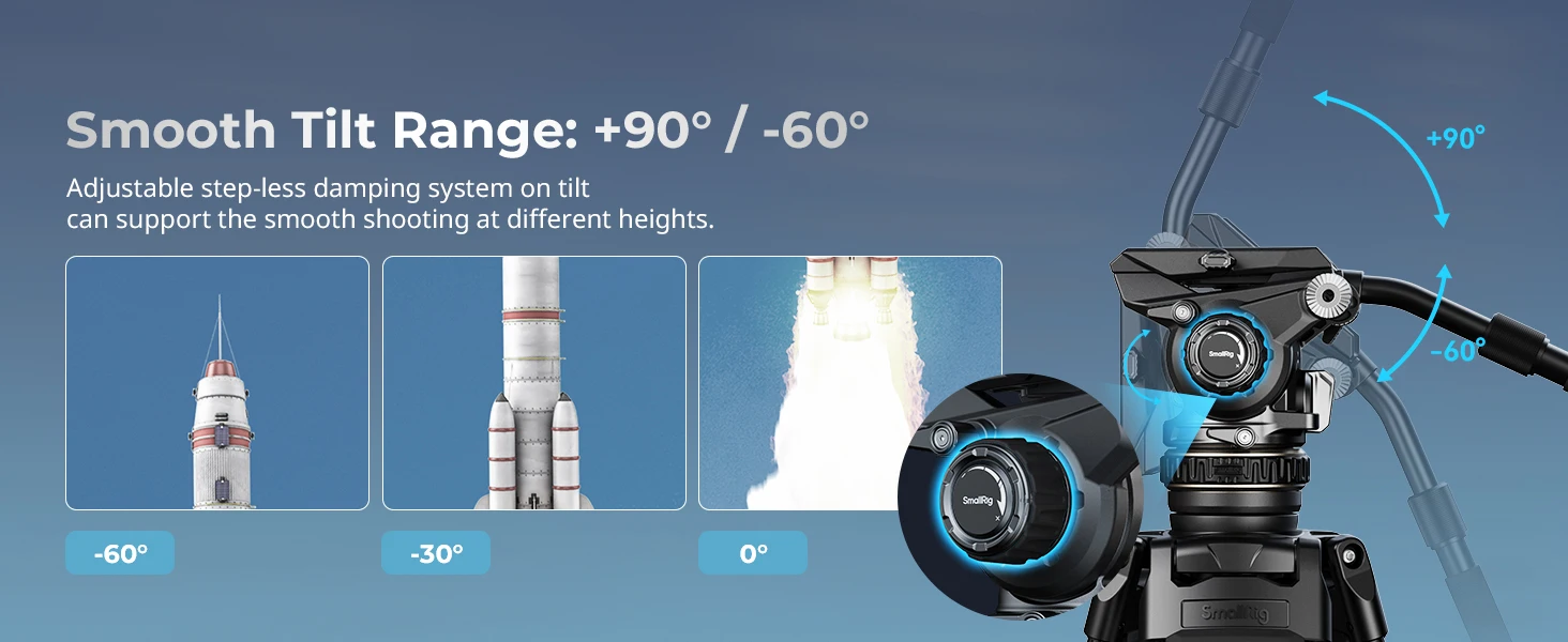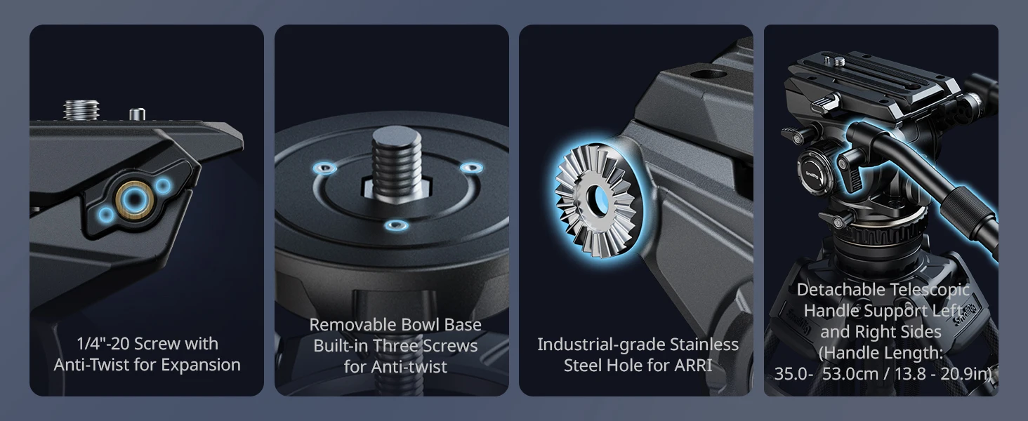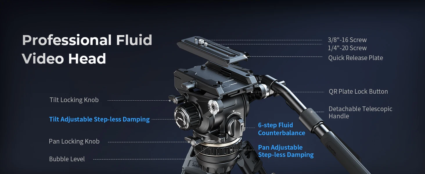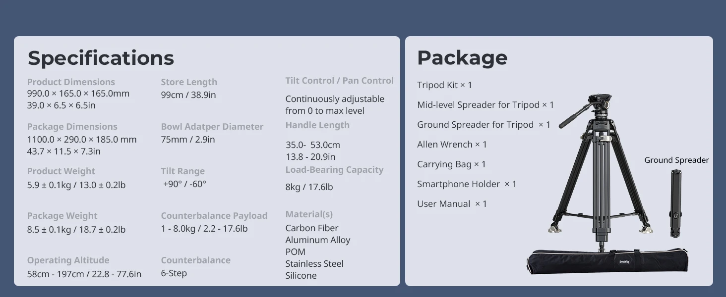SmallRig Heavy-Duty Carbon Fiber Tripod Kit AD-120 4463 is a professional video tripod kit to facilitate video shooting. The tripod has adjustable legs, which can be quickly retracted and extended via flip locks. Operating Altitude ranges from 58cm (22.9in) to 197cm (77.6in), and the folded length is 99cm (38.9in). The fluid head features an adjustable 6-step counterbalance system. When the height of the gravitational center is 55mm / 2.2", the 6-step counterbalance system balances the camera or other rigs (up to 8kg / 17.6lb) and accurately controls the camera tilt. The adjustable step-less damping system enables swivel and tilt adjustment and provides smooth pan and tilt camera movements. The fluid head 4464 adopts a new Touch-and-Go quick release mount plate design which does not require alignment and is more efficient than traditional slide-in plates. It is DJI RS Series quick release plate and Manfrotto quick release plate compatible to realize a free switch between stabilizer shooting and tripod shooting. The user-friendly detachable telescopic handle allows rotation and attaching it to both left and right sides, making it suitable for any grip.