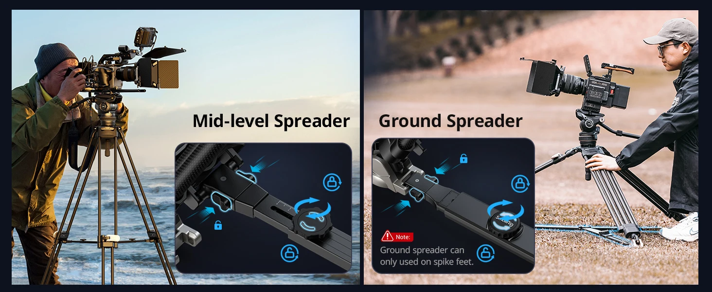 3. Please lock the mid-level spreader and ground spreader before using this tripod