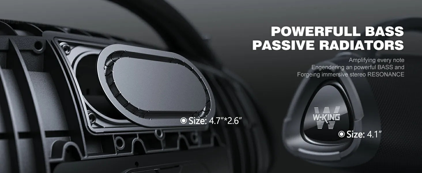 Excellent Three Bass Passive Radiators & DSP: Bass passive radiators on the left, right and back (large) cover the entire speaker space, allowing the portable speaker bluetooth to deliver throundrous bass and powerful resonate. DSP chip allows for real-time audio processing, ensuring that every sound, from the subtlest whisper to the booming bass, is delivered with exceptional clarity. Take the portable bluetooth speakers to enjoy a high-fidelity audio experience across various music genres