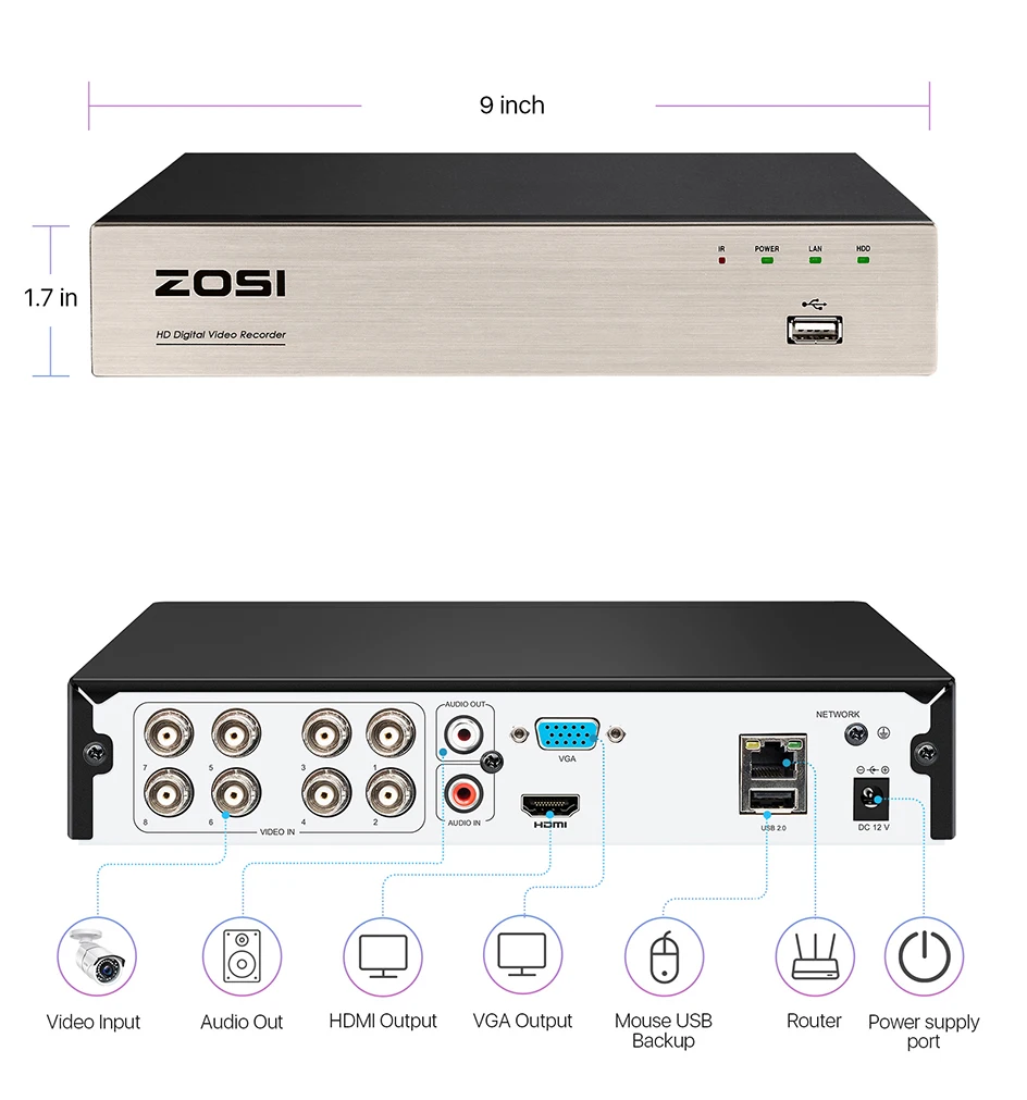 ZOSI 1080P 8 Channel 8CH AHD CVI TVI CVBS DVR 1920*1080 2MP CCTV Video Recorder Hybrid Cam Security System