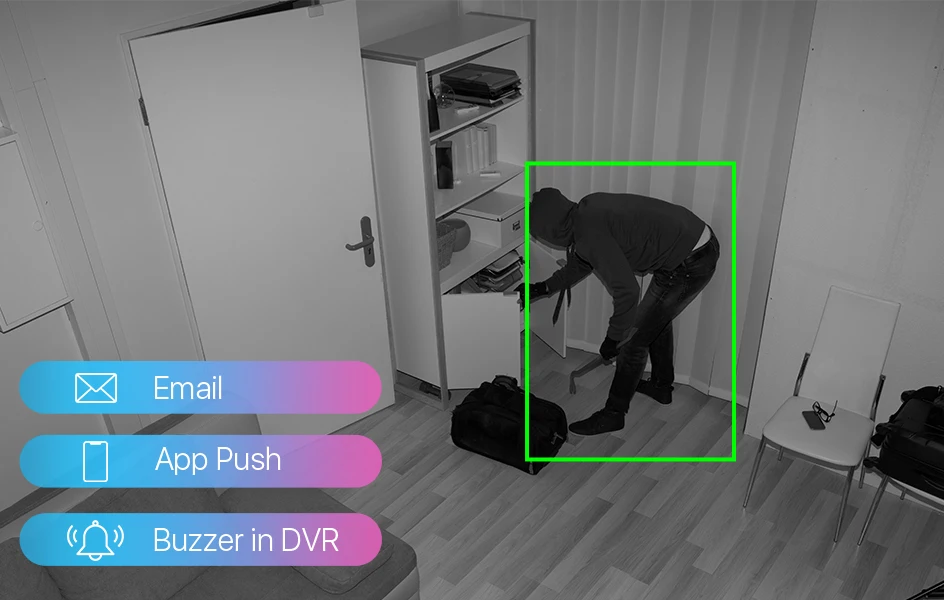 Get email/push/buzzer alerts, and check motion events on the FTP later to keep yourself in the know.